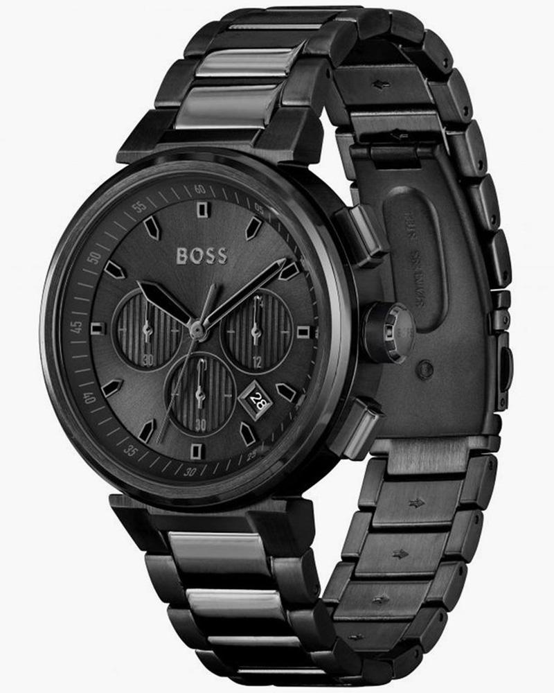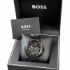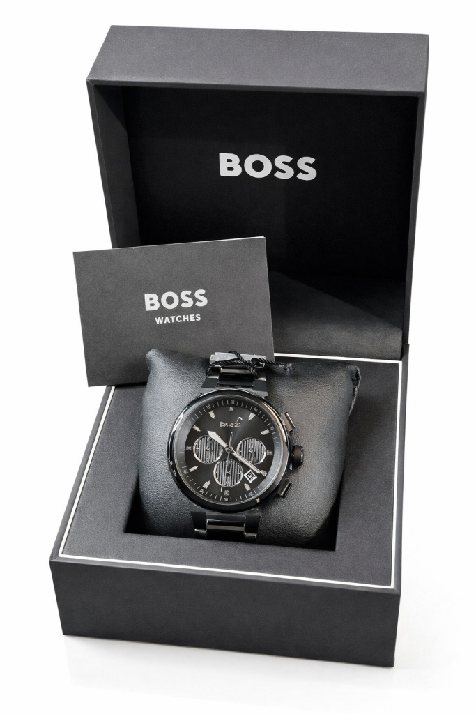 Reloj Hugo Boss de diseño elegante y contemporáneo, con caja y pulsera en tono negro que transmiten sobriedad y estilo. Su esfera con detalles tipo cronógrafo aporta un toque moderno y funcional, ideal para quienes buscan un accesorio versátil, perfecto tanto para el uso diario como para ocasiones especiales.