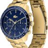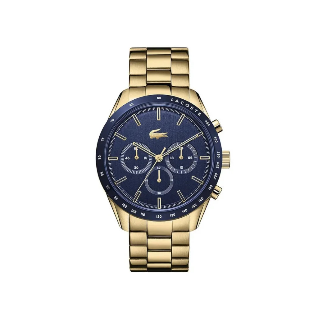 El Lacoste Boston LC‑2011096 de Lacoste es un reloj masculino elegante con cronógrafo, movimiento de cuarzo (batería), caja y brazalete de acero inoxidable en tono dorado, esfera azul, cristal mineral y resistencia al agua de 50 m, con un diseño moderno ideal para uso diario o formal.