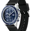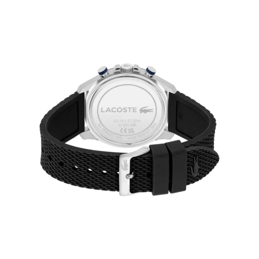 El Lacoste Neo Heritage de Lacoste es un reloj masculino deportivo-elegante con cronógrafo, caja de acero inoxidable de 43 mm, esfera azul, correa de silicona negra, cristal mineral, movimiento de cuarzo (batería) y resistencia al agua de 50 m, ideal para uso diario.